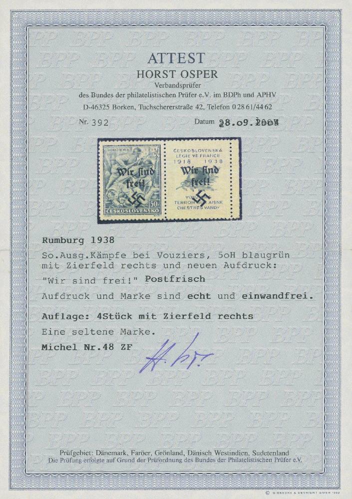 | Zusatzinformationen und Suchstichworte: | Ulrich Felzmann 175. Auktion Auktionstermin: 30. Juni 2022 Los 5841 Sudetenland Rumburg 50 H Vouziers mit rechts ungefaltet anhängendem, ebenfalls überdrucktem Leerfeld sowie kleinem Bogenrand, tadellos vollzähnig mit ganz minimaler Haftspur in annähernd postfrischer Luxuserhaltung, sign. Dr. Oertel und Mahr BPP sowie Fotoatteste Osper BPP und Brunel "... einwandfrei ... äußerst selten" Zuschlag 1.000,00 EUR |