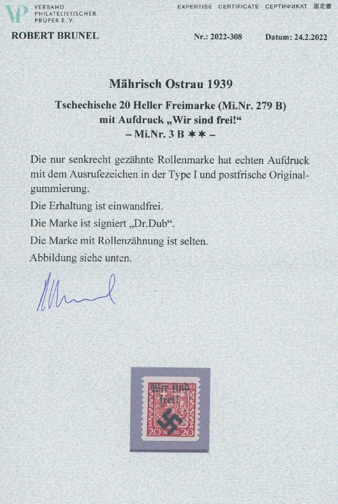 | Zusatzinformationen und Suchstichworte: | Ulrich Felzmann 175. Auktion Auktionstermin: 30. Juni 2022 Los 5620 Böhmen und Mähren Mährisch-Ostrau 20 H Wappen, nur senkrecht gezähnte Rollenmarke in tadellos postfrischer Top-Erhaltung, sign. Dr. Dub sowie Fotoattest Brunel "... einwandfrei ... selten", € 900,- Zuschlag 360,00 EUR |