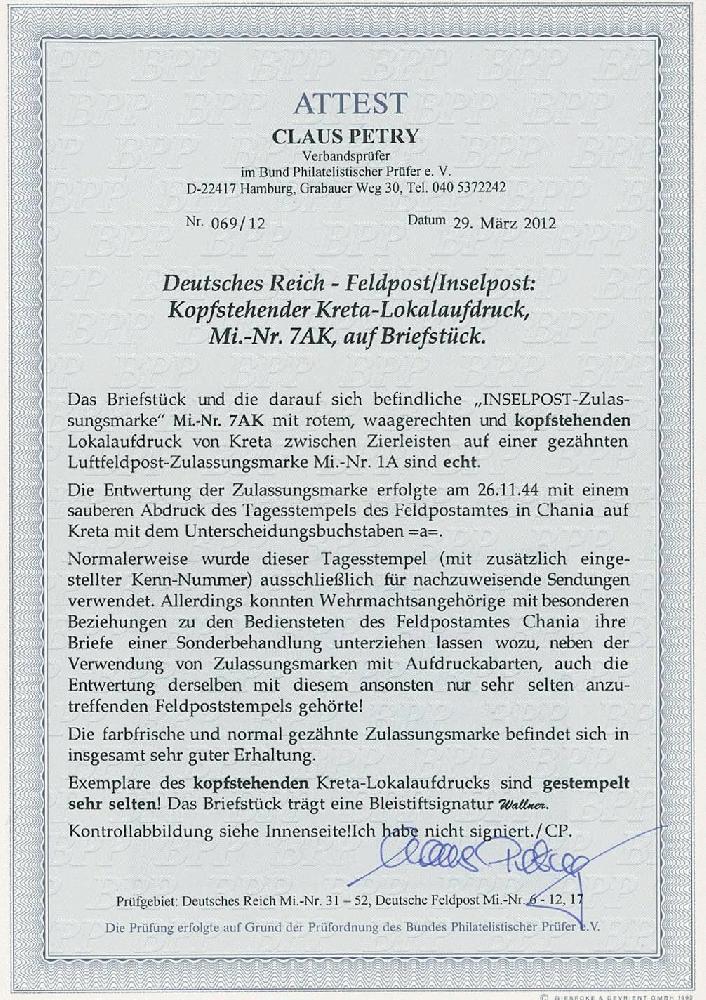 | Zusatzinformationen und Suchstichworte: | Ulrich Felzmann 175. Auktion Auktionstermin: 30. Juni 2022 Los 5862 Deutsche Besetzung II. WK, Feldpostmarken Kreta gezähnt mit kopfstehendem Aufdruck mit seltenem, sonst nur für nachzuweisende Sendungen verwendetem FP-Normstempel "a" 08.11.44 des Feldpostamtes in Chania auf tadellosem Liebhaber-Briefstück, insgesamt sehr gut erhaltenes, farbfrisches und normal gezähntes Ausnahme-Exemplar dieser sehr seltenen Abart, sign. Wallner sowie Fotoatteste Müller und Petry BPP "... sehr selten!", € 6.000,- Ausruf 2.000,00 EUR |
