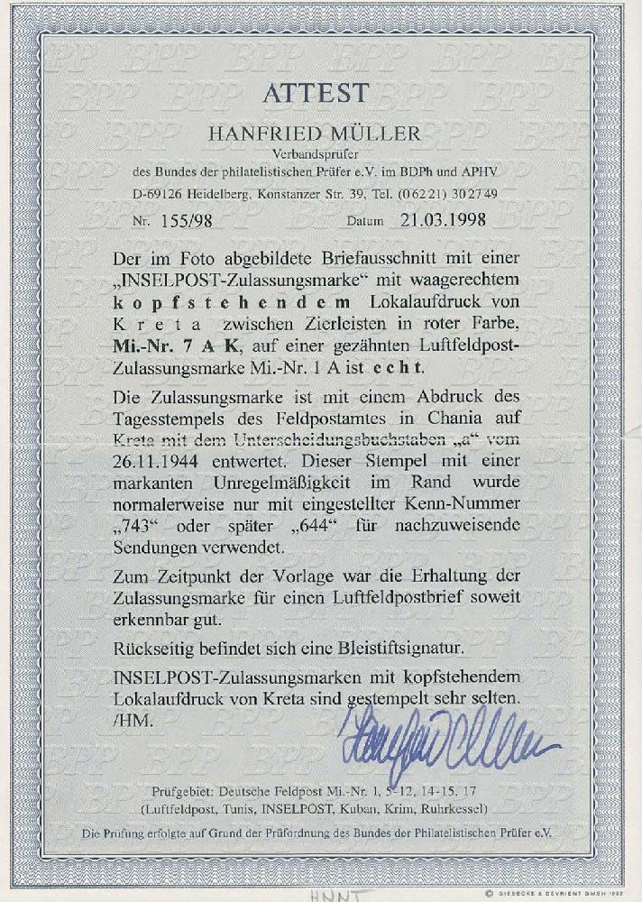 | Zusatzinformationen und Suchstichworte: | Ulrich Felzmann 175. Auktion Auktionstermin: 30. Juni 2022 Los 5862 Deutsche Besetzung II. WK, Feldpostmarken Kreta gezähnt mit kopfstehendem Aufdruck mit seltenem, sonst nur für nachzuweisende Sendungen verwendetem FP-Normstempel "a" 08.11.44 des Feldpostamtes in Chania auf tadellosem Liebhaber-Briefstück, insgesamt sehr gut erhaltenes, farbfrisches und normal gezähntes Ausnahme-Exemplar dieser sehr seltenen Abart, sign. Wallner sowie Fotoatteste Müller und Petry BPP "... sehr selten!", € 6.000,- Ausruf 2.000,00 EUR |