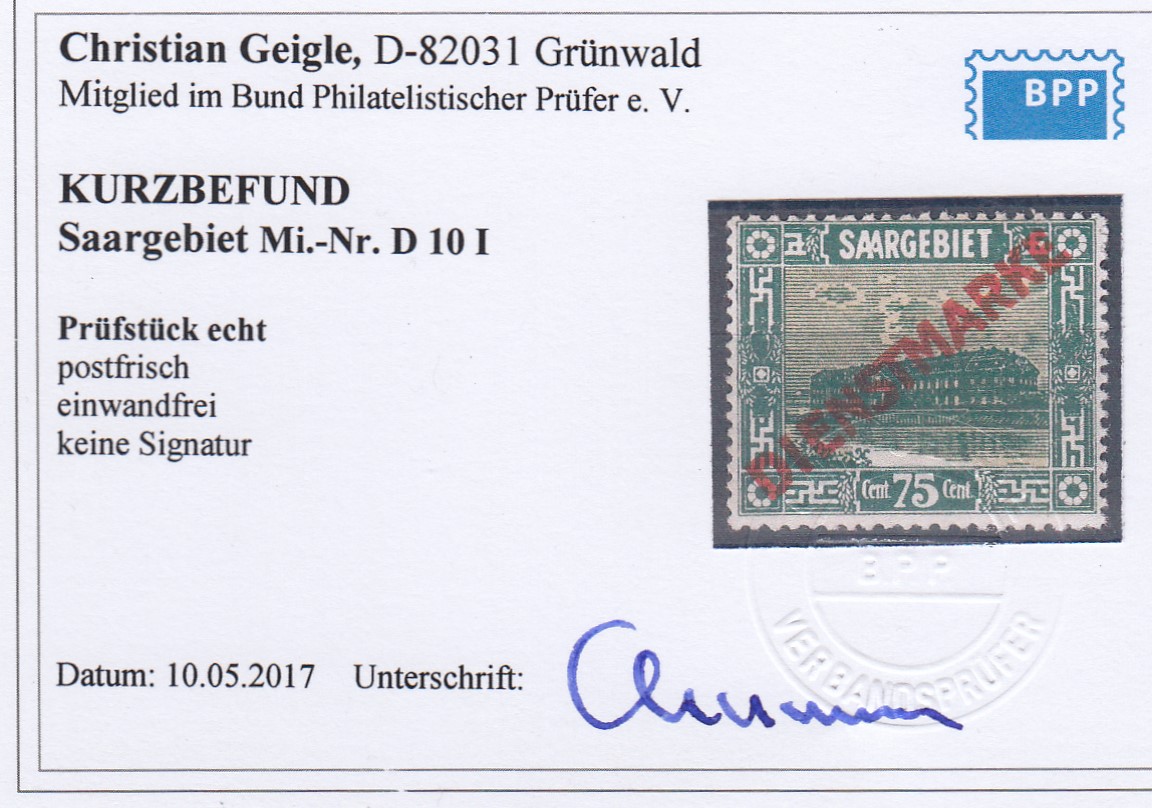 | Prüfgebiet: | Saargebiet Dienstmarken |