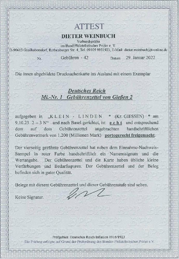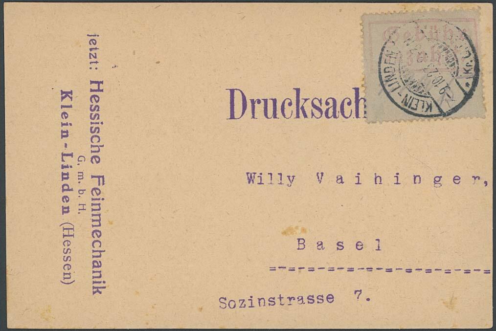 | Zusatzinformationen und Suchstichworte: | Ulrich Felzmann 175. Auktion Auktionstermin: 30. Juni 2022 Los 5260 Deutsche Lokalausgabe 1918-23 GIESSEN 2, Gebührenzettel mit eingetragener Gebühr "1.200" (Millionen Mark) und Namenssignum, tarifrichtig auf rs. attraktiv bedruckter Auslands-Drucksachenkarte KLEIN-LINDEN 9.10.23 nach Basel in die Schweiz, übliche kleine Verfärbungen und Bedarfsspuren, darüber hinaus gut und ursprünglich erhalten, Fotoattest Weinbuch BPP "... in guter Qualität. Belege mit diesem Gebührenzettel und dieser Gebührenstufe sind selten" Zuschlag 180,00 EUR |