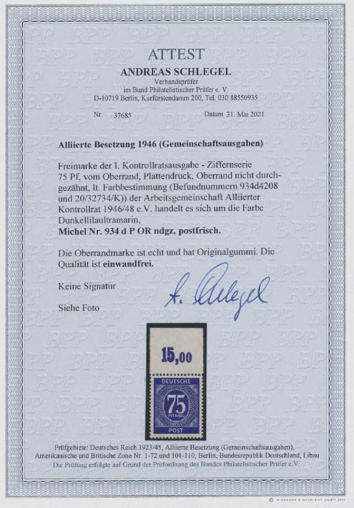 | Zusatzinformationen und Suchstichworte: | Ulrich Felzmann 175. Auktion Auktionstermin: 30. Juni 2022 Los 6024 Gemeinschaftsausgaben 75 Pfg dunkellilaultramarin, postfrisches Plattendruck-Oberrandstück, Fotoattest A. Schlegel BPP "... einwandfrei", € 1.500,- Zuschlag 225,00 EUR |