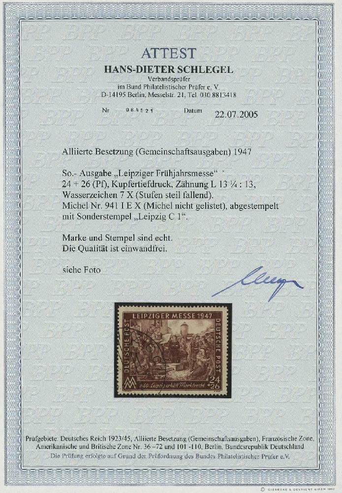 | Zusatzinformationen und Suchstichworte: | Ulrich Felzmann 175. Auktion Auktionstermin: 30. Juni 2022 Los 6028 Gemeinschaftsausgaben 24 Pfg Leipziger Messe, gez. L 13¼:13, steil fallende Stufen im Wz., sauber mit SST, Fotoattest H.-D. Schlegel BPP "... einwandfrei", € 1.100,- Zuschlag 250,00 EUR |