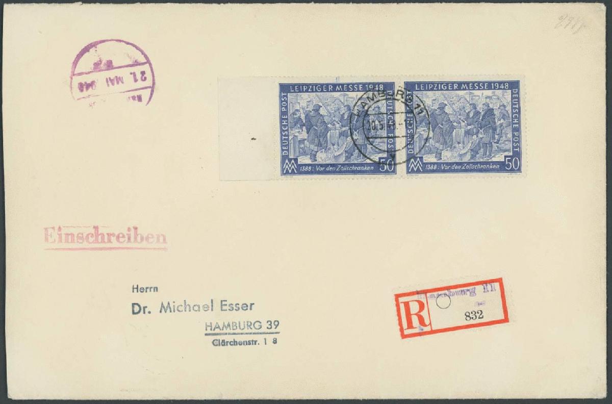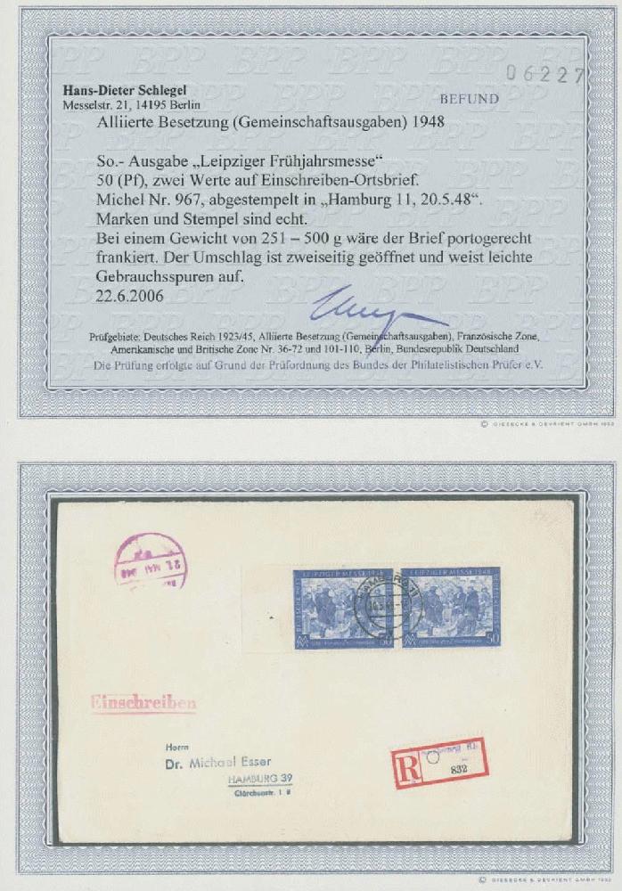 | Zusatzinformationen und Suchstichworte: | Ulrich Felzmann 175. Auktion Auktionstermin: 30. Juni 2022 Los 6039 Gemeinschaftsausgaben 50 Pfg Leipziger Messe, waagerechtes Paar mit linkem Rand in portogerechter, nicht gelisteter MeF auf schwerem Orts-R-Brief HAMBURG 20.5.48 im Gewicht über 250 g mit Ankunft 21.5.48 und Eingangsvermerk der Firma, zweiseitig offen, sehr seltene MeF-Version, Fotobefund H.D. Schlegel BPP "... portogerecht" Ausruf 250,00 EUR |