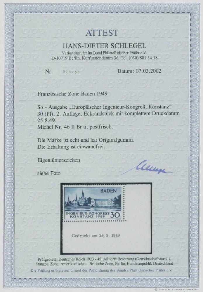 | Zusatzinformationen und Suchstichworte: | Ulrich Felzmann 175. Auktion Auktionstermin: 30. Juni 2022 Los 6248 Französische Zone Baden Konstanz II, ungefaltete Bogenecke unten rechts mit kpl. Druckdatum, sign., Luxus, Fotoattest Schlegel BPP "einwandfrei", € 4.000,- Ausruf 1.750,00 EUR |