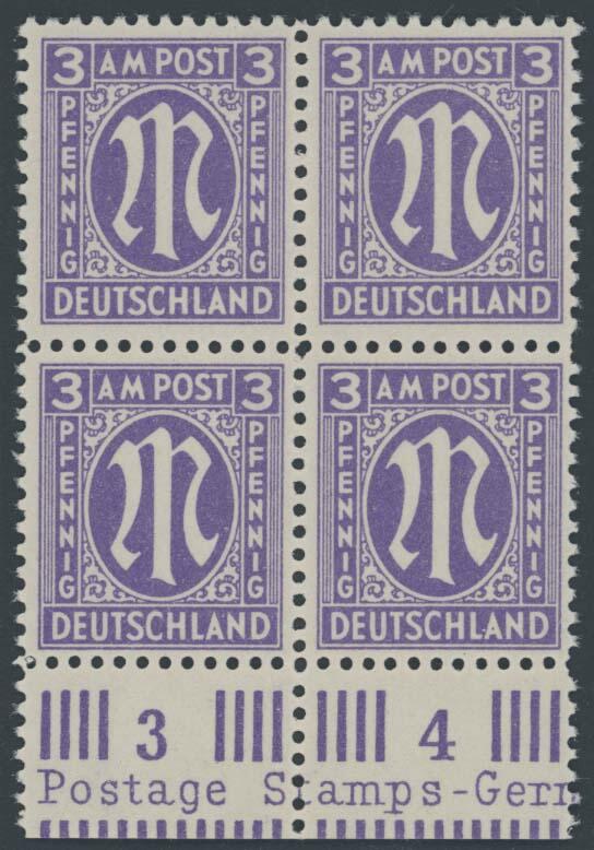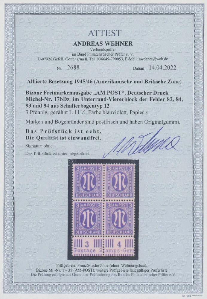 | Zusatzinformationen und Suchstichworte: | Ulrich Felzmann 175. Auktion Auktionstermin: 30. Juni 2022 Los 6265 Bizone 3 Pfg blauviolett gez. L 11½, postfrischer Unterrand-Viererblock, Fotoattest Wehner BPP "... einwandfrei" Zuschlag 270,00 EUR |