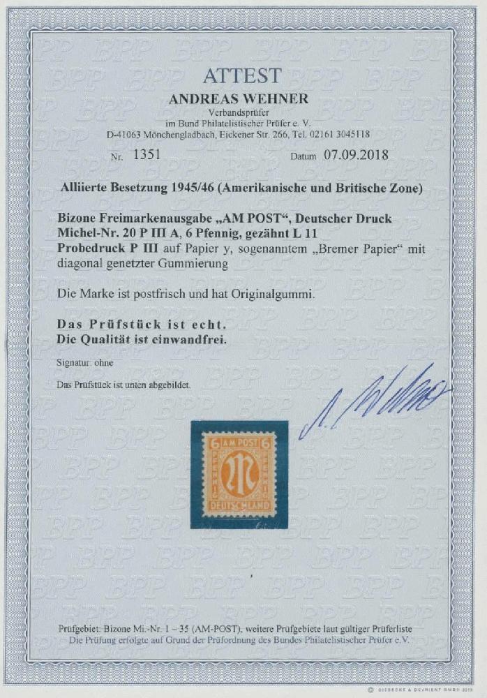 | Zusatzinformationen und Suchstichworte: | Ulrich Felzmann 175. Auktion Auktionstermin: 30. Juni 2022 Los 6266 Bizone 6 Pfg, Probedruck auf Bremer Papier mit diagonal genetzter Gummierung, postfrisch, Pracht, Fotoattest Wehner BPP "... einwandfrei" Zuschlag 270,00 EUR |