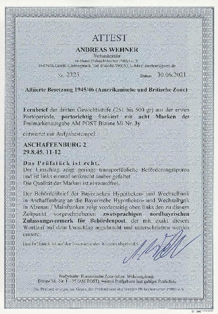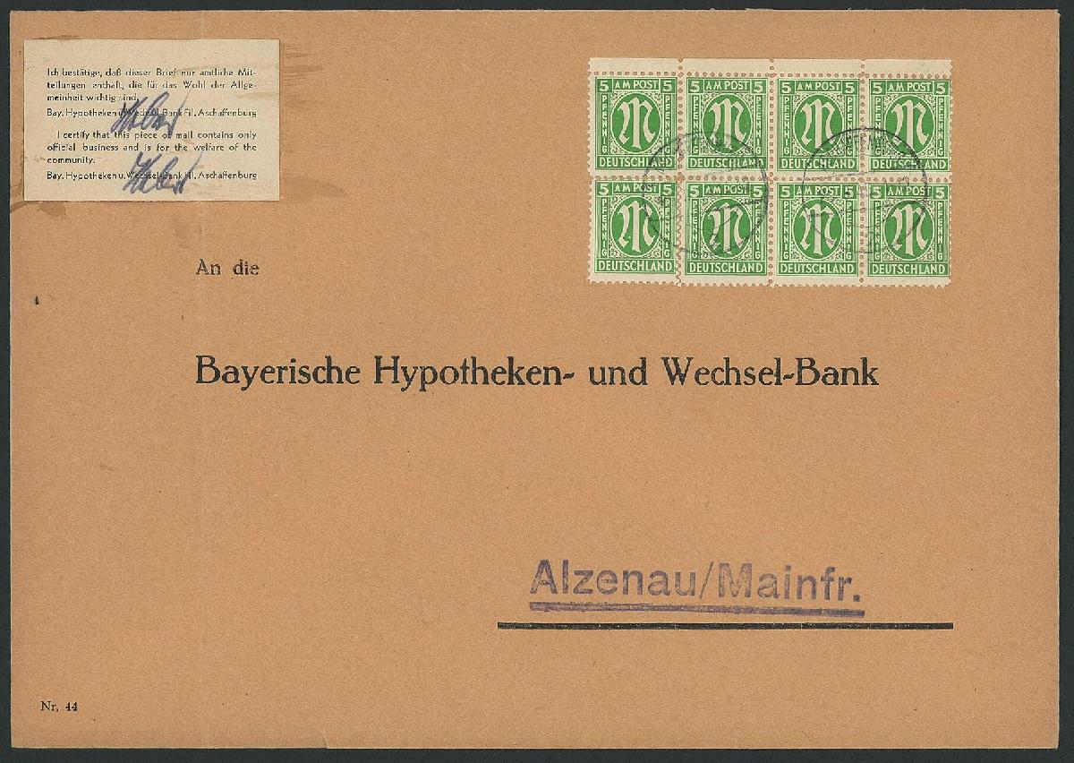 | Zusatzinformationen und Suchstichworte: | Ulrich Felzmann 175. Auktion Auktionstermin: 30. Juni 2022 Los 6269 Bizone 5 Pfg im waagerechten Achterblock als MeF auf Fernbrief der 3. Gewichtsstufe aus der ersten Portoperiode, portogerecht mit 40 Pfg frankiert auf vollständigem Umschlag mit senkrechter Faltspur und transportüblichen Beförderungsspuren ab ASCHAFFENBURG 29.8.45 mit zweisprachigem nordbayerischem Zulassungsvermerk für Behördenpost, Fotoattest Wehner BPP "... Die Qualität der Marken ist einwandfrei" Zuschlag 350,00 EUR |