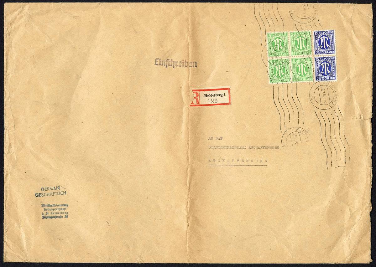 | Zusatzinformationen und Suchstichworte: | Ulrich Felzmann 175. Auktion Auktionstermin: 30. Juni 2022 Los 6270 Bizone 5 Pfg im Viererblock mit einmal Plattenfehler III sowie 25 Pfg im Paar als MiF auf großem R-Fernbrief der 3. Gewichtsstufe aus der ersten Portoperiode, portogerecht mit 70 Pfg frankiert und auf vollständig erhaltenem Umschlag mit Mittelbug ab HEIDELBERG 20.2.46 mit den unvermeidbaren Beförderungsspuren, Knittern und kleinen Einrissen. Ausführliches Fotoattest Wehner BPP Ausruf 250,00 EUR |