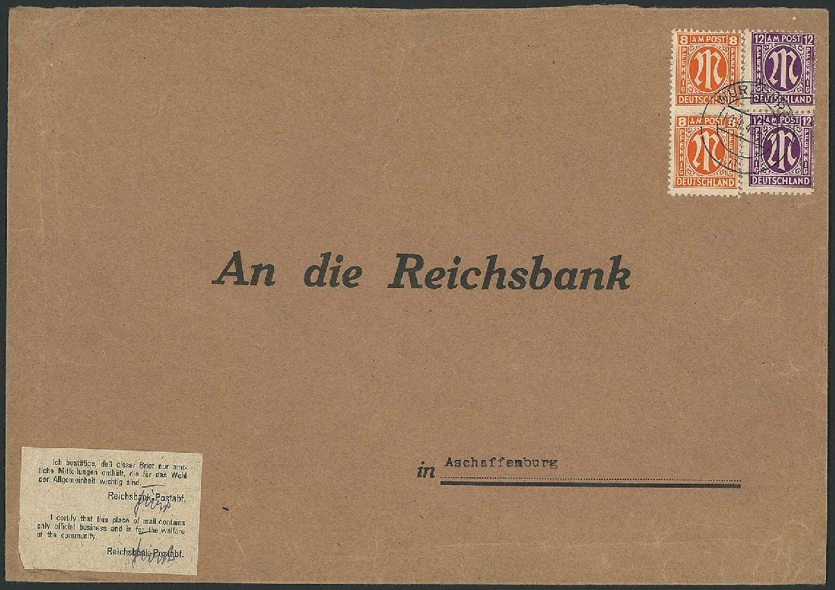 | Zusatzinformationen und Suchstichworte: | Ulrich Felzmann 175. Auktion Auktionstermin: 30. Juni 2022 Los 6271 Bizone 8 und 12 Pfg, je im senkrechten Paar als MiF auf Fernbrief der 3. Gewichtsstufe aus der ersten Portoperiode, portogerecht mit 40 Pfg frankiert auf vollständigem Umschlag mit geringen transportüblichen Spuren ab WÜRZBURG 10.9.45 mit zweisprachigem nordbayerischem Zulassungsvermerk für Behördenpost mit dort Setzfehler "place statt piece", Fotoattest Wehner BPP Ausruf 250,00 EUR |