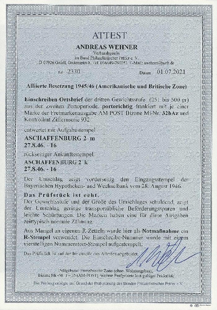 | Zusatzinformationen und Suchstichworte: | Ulrich Felzmann 175. Auktion Auktionstermin: 30. Juni 2022 Los 6277 Bizone 50 Pfg Deutscher Druck und 50 Pfg Ziffer als MiF auf R-Ortsbrief der 3. Gewichtsstufe aus der zweiten Portoperiode, portogerecht mit 100 Pfg frankiert auf vollständigem Umschlag mit leichten Beförderungsspuren ab ASCHAFFENBURG 27.8.46 mit rs. Ank.-Stempel und als Notmaßnahme R-Stempel statt R-Zettel, im Michel unbekannte Portostufe, Fotoattest Wehner BPP Ausruf 400,00 EUR |