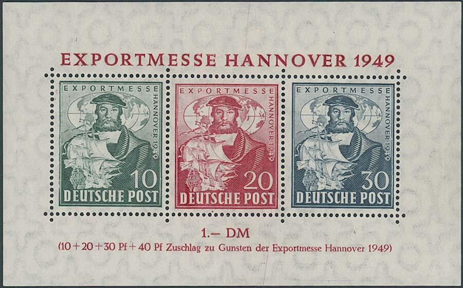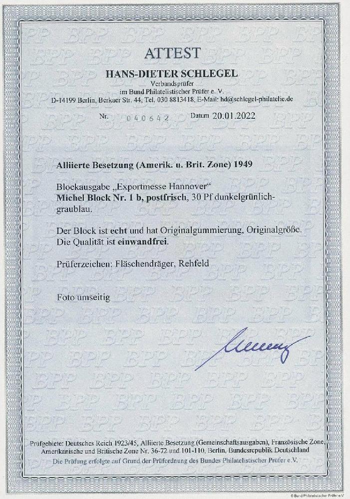 | Zusatzinformationen und Suchstichworte: | Ulrich Felzmann 175. Auktion Auktionstermin: 30. Juni 2022 Los 6283 Bizone Exportmesse-Block mit 30 Pfg dunkelgrünlichgraublau, postfrisches, vollformatiges Top-Stück dieser seltensten Variante, sign. Fläschendräger und Rehfeld sowie Fotoattest H.-D. Schlegel BPP "... einwandfrei", € 3.400,- Ausruf 900,00 EUR |