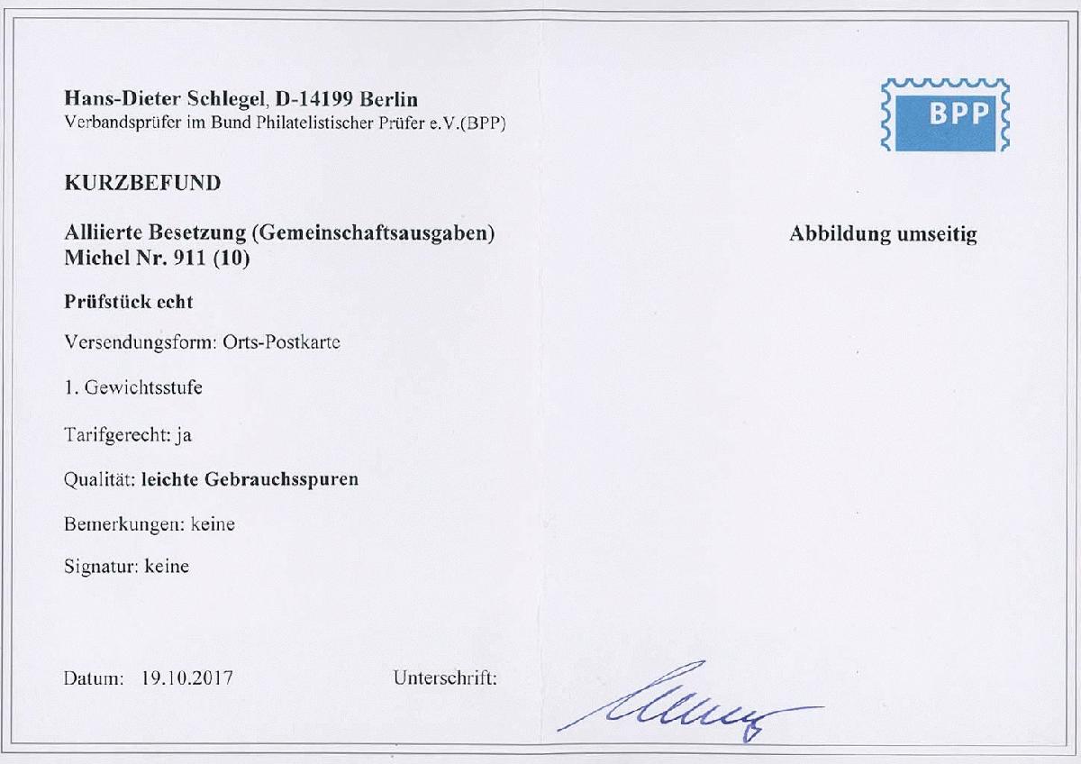 | Zusatzinformationen und Suchstichworte: | Ulrich Felzmann 175. Auktion Auktionstermin: 30. Juni 2022 Los 6175 Berlin Vorläufer 1 Pfg Ziffern, zehn Stück in seltener MeF auf Ortskarte aus BERLIN O17 am 2.9.46, Kurzbefund H.D. Schlegel BPP "... einwandfrei" Zuschlag 185,00 EUR |