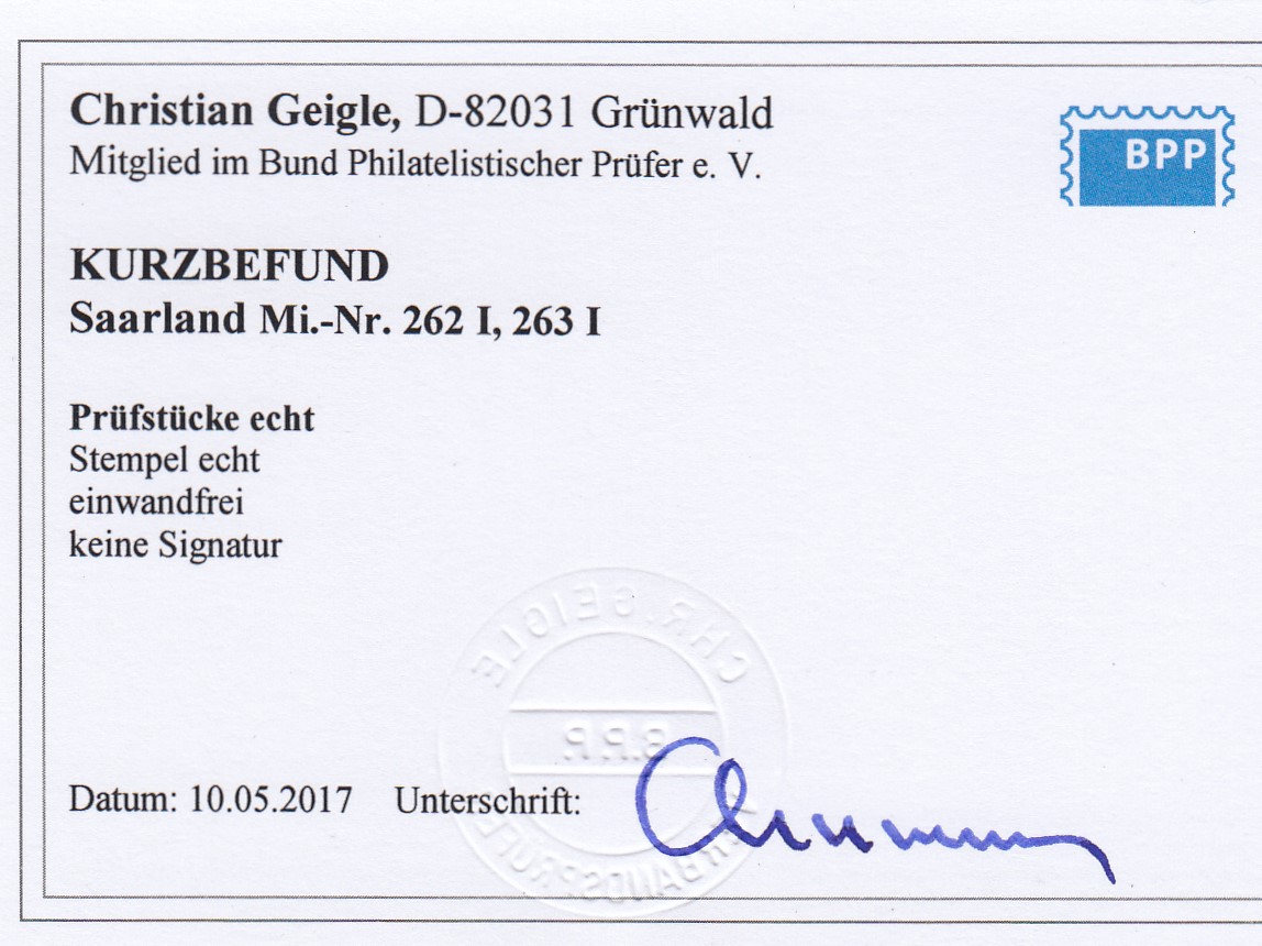 | Prüfgebiet: | Saarland (ab Mi-Nr. 206) |