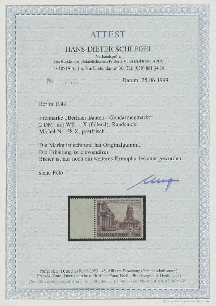 | Zusatzinformationen und Suchstichworte: | Ulrich Felzmann 175. Auktion Auktionstermin: 30. Juni 2022 Los 6199 Berlin 2 DM Bauten mit dem sehr seltenen Wasserzeichen "fallend", vorgefaltetes postfrisches linkes Randstück (!) in unsignierter Top-Qualität, Fotoatteste H.-D. und A. Schlegel BPP "... einwandfrei. Bis heute sind mir nur sehr wenige postfrische Marken dieser Ausgabe bekannt", € 15.000,- Zuschlag 5.000,00 EUR |