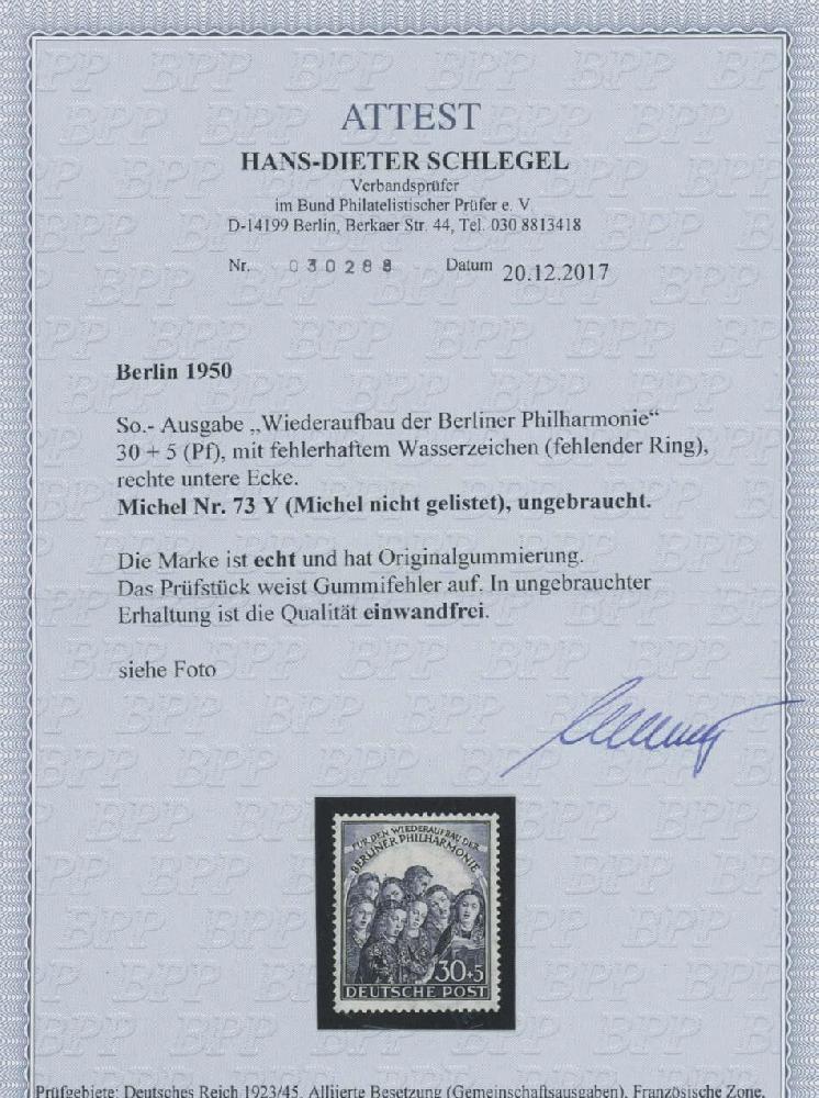 | Zusatzinformationen und Suchstichworte: | Ulrich Felzmann 175. Auktion Auktionstermin: 30. Juni 2022 Los 6208 Berlin 30 Pfg Berliner Philharmonie mit fehlerhaftem Wasserzeichen "fehlender Ring" in der rechten unteren Ecke, ungebraucht in Prachterhaltung, Fotoattest Schlegel BPP "... einwandfrei" Ausruf 1.000,00 EUR |