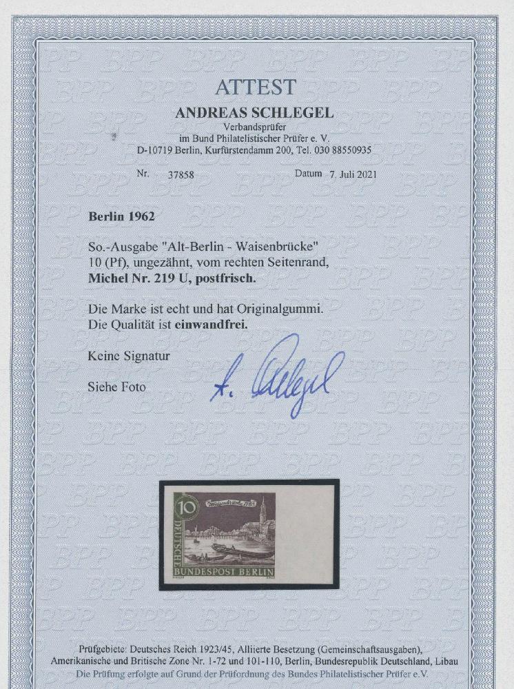 | Zusatzinformationen und Suchstichworte: | Ulrich Felzmann 175. Auktion Auktionstermin: 30. Juni 2022 Los 6213 Berlin 10 Pfg Alt-Berlin ungezähnt, postfrisches rechtes Randstück (!) in unsignierter Top-Qualität, Fotoatteste H.-D. und A. Schlegel BPP "... einwandfrei", € 1.000,- Zuschlag 320,00 EUR |