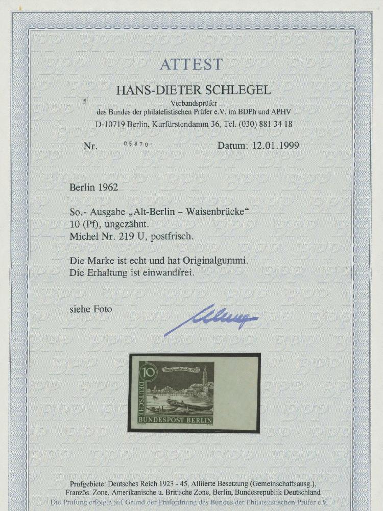 | Zusatzinformationen und Suchstichworte: | Ulrich Felzmann 175. Auktion Auktionstermin: 30. Juni 2022 Los 6213 Berlin 10 Pfg Alt-Berlin ungezähnt, postfrisches rechtes Randstück (!) in unsignierter Top-Qualität, Fotoatteste H.-D. und A. Schlegel BPP "... einwandfrei", € 1.000,- Zuschlag 320,00 EUR |