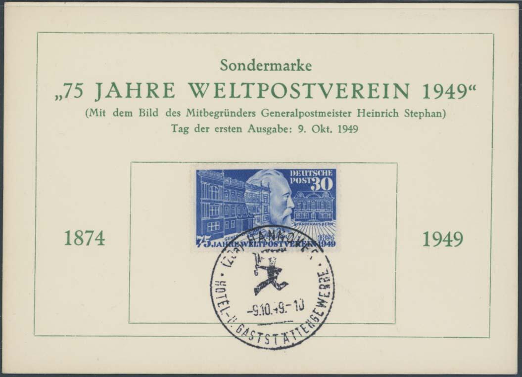 | Zusatzinformationen und Suchstichworte: | Ulrich Felzmann 175. Auktion Auktionstermin: 30. Juni 2022 Los 6287 Bundesrepublik Deutschland 30 Pfg Stephan auf Sonderkarte mit ESST HANNOVER HOTEL- UND GASTSTÄTTENGEWERBE 9.10.49, Fotoattest A. Schlegel BPP "... einwandfrei", € 1.400,- Zuschlag 170,00 EUR |