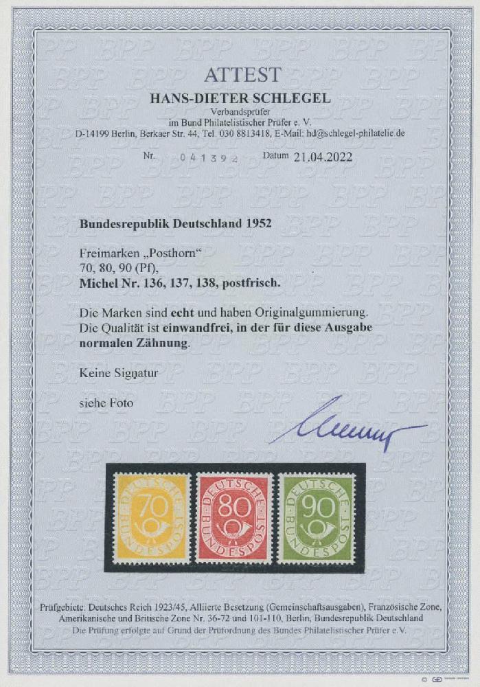 | Zusatzinformationen und Suchstichworte: | Ulrich Felzmann 175. Auktion Auktionstermin: 30. Juni 2022 Los 6290 Bundesrepublik Deutschland Posthornsatz komplett postfrisch, bis 60 Pfg alle sign. D. Schlegel BPP, 70, 80 und 90 Pfg hingegen unsigniert mit Fotoattest H.-D. Schlegel BPP "... einwandfrei, in der für diese Ausgabe normalen Zähnung" Zuschlag 400,00 EUR |