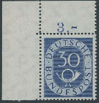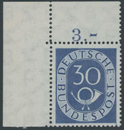| Zusatzinformationen und Suchstichworte: | Ulrich Felzmann 175. Auktion Auktionstermin: 30. Juni 2022 Los 6306 Bundesrepublik Deutschland 30 Pfg Posthorn, ungefaltete "große" Bogenecke links oben, tadellos postfrisch, unsigniert, Luxus Zuschlag 160,00 EUR |