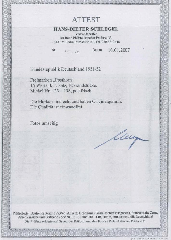 | Zusatzinformationen und Suchstichworte: | Posthorn-Satz zum Attest auf mehrere Auktionslose aufgeteilt worden: Ulrich Felzmann 175. Auktion Auktionstermin: 30. Juni 2022 Los 6313 Bundesrepublik Deutschland 70 Pfg Posthorn, ungefaltete Bogenecke links oben mit nicht durchgezähntem Rand, tadellos postfrisch, unsigniert, Luxus Zuschlag 675,00 EUR Ulrich Felzmann 175. Auktion Auktionstermin: 30. Juni 2022 Los 6318 Bundesrepublik Deutschland 80 Pfg Posthorn, ungefaltete Luxus-Bogenecke links oben, nicht durchgezähnter Rand, völlig ohne Büge, sign. Schlegel BPP Zuschlag 585,00 EUR |