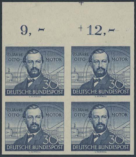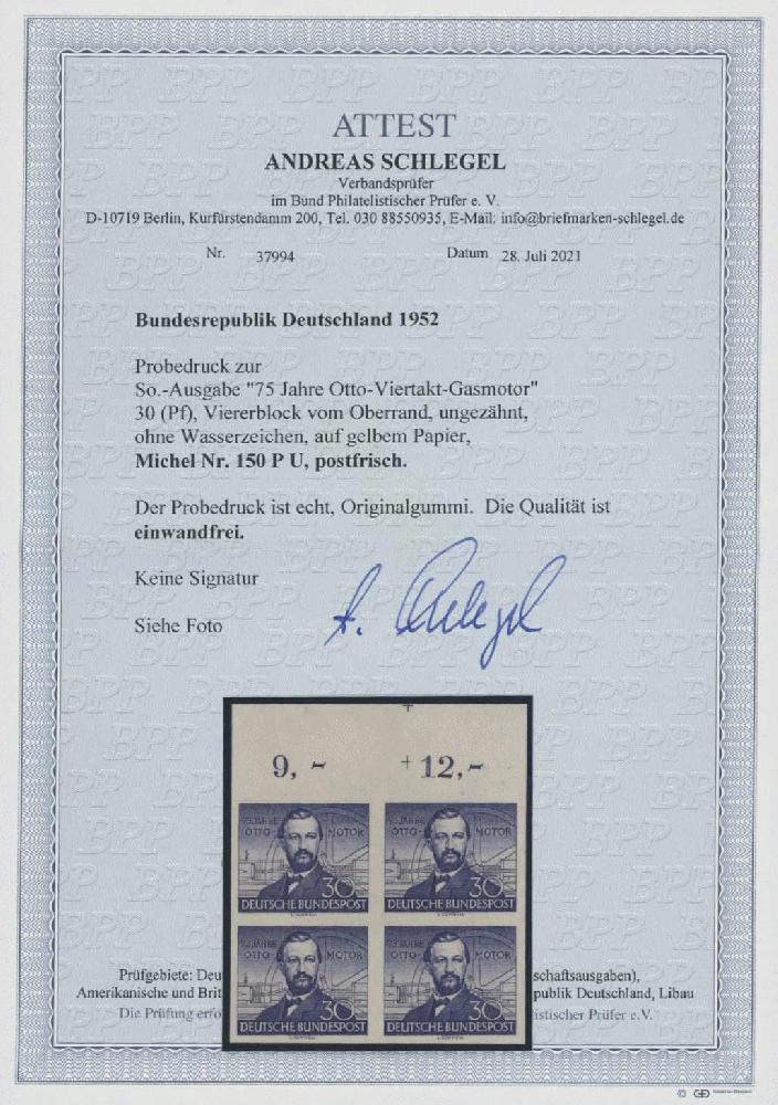 | Zusatzinformationen und Suchstichworte: | Ulrich Felzmann 175. Auktion Auktionstermin: 30. Juni 2022 Los 6327 Bundesrepublik Deutschland 30 Pfg Otto, ungezähnter Probedruck auf gelbem Papier im Viererblock mit oberem Bogenrand und dort Passerkreuz, postfrisch, Fotoattest A. Schlegel BPP "... einwandfrei", € 4.000,- Zuschlag 720,00 EUR |