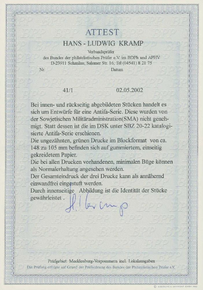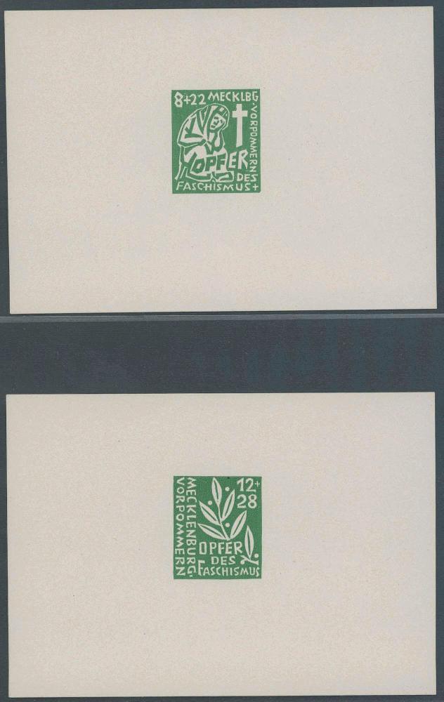| Zusatzinformationen und Suchstichworte: | Ulrich Felzmann 175. Auktion Auktionstermin: 30. Juni 2022 Los 6059 SBZ Mecklenburg Vorpommern 3 Essays zur Antifa-Ausgabe Mi.-Nr. 20-22, alle in grün im Blockformat mit Motiv "gesprengte Ketten", "trauernde Frau" und "Blumenranke", postfrisch, Fotoattest Kramp BPP "... annähernd einwandfrei", € 1.800,- Zuschlag 360,00 EUR |