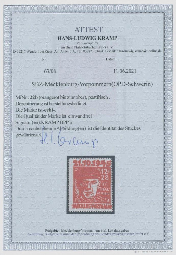 | Zusatzinformationen und Suchstichworte: | Ulrich Felzmann 175. Auktion Auktionstermin: 30. Juni 2022 Los 6064 SBZ Mecklenburg Vorpommern 12 Pfg Thälmann, orangerot, postfrisch, Fotoattest Kramp BPP "... einwandfrei" Zuschlag 140,00 EUR |