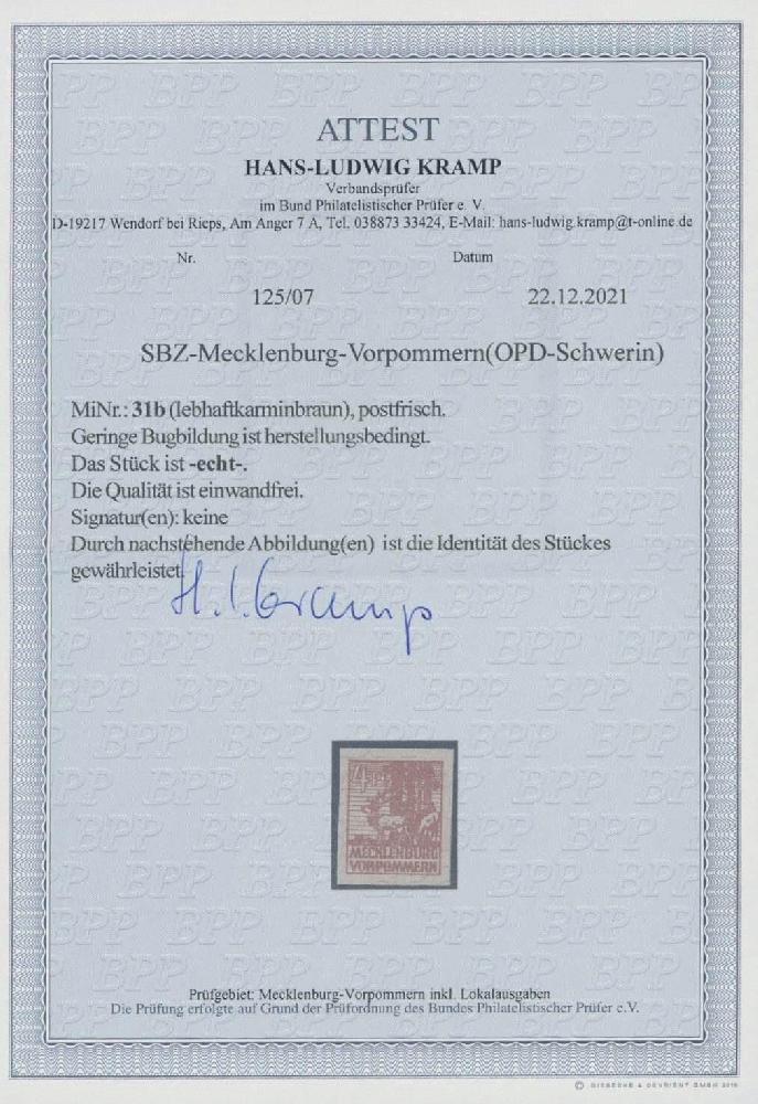 | Zusatzinformationen und Suchstichworte: | Ulrich Felzmann 175. Auktion Auktionstermin: 30. Juni 2022 Los 6067 SBZ Mecklenburg Vorpommern 4 Pfg lebhaftkarminbraun postfrisch, Fotoattest Kramp BPP "... einwandfrei", € 450,- Ausruf 100,00 EUR |