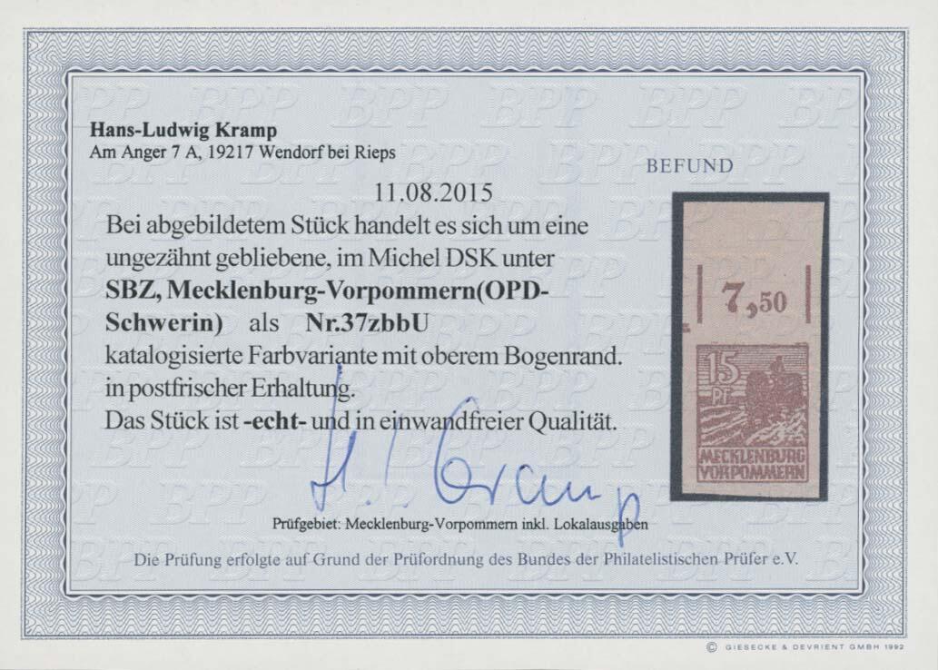 | Zusatzinformationen und Suchstichworte: | Ulrich Felzmann 175. Auktion Auktionstermin: 30. Juni 2022 Los 6072 SBZ Mecklenburg Vorpommern 15 Pfg Abschied schwärzlichgelbbraun auf z-Papier, ungezähnt, postfrisch mit Oberrand, unsigniert, Fotobefund Kramp BPP "... einwandfrei", € 600,- Ausruf 150,00 EUR |