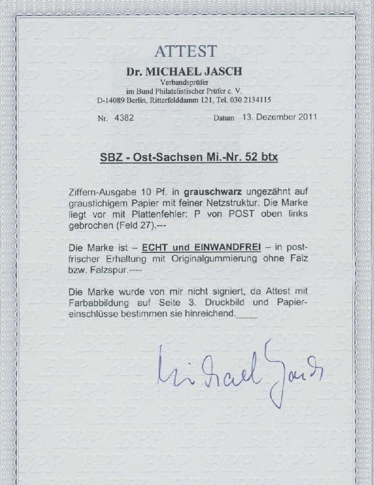 | Zusatzinformationen und Suchstichworte: | Ulrich Felzmann 175. Auktion Auktionstermin: 30. Juni 2022 Los 6092 SBZ Ostsachsen 10 Pfg grauschwarz, postfrisches Prachtstück, Fotoattest Dr. Jasch BPP "... einwandfrei", € 800,- Ausruf 200,00 EUR |