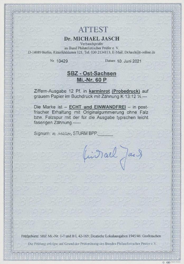 | Zusatzinformationen und Suchstichworte: | Ulrich Felzmann 175. Auktion Auktionstermin: 30. Juni 2022 Los 6096 SBZ Ostsachsen 12 Pfg karminrot, Probedruck mit typisch faseriger Zähnung 13:12½, postfrisch, Fotoatteste Sturm und Dr. Jasch BPP "... einwandfrei", € 1.200,- Ausruf 250,00 EUR |