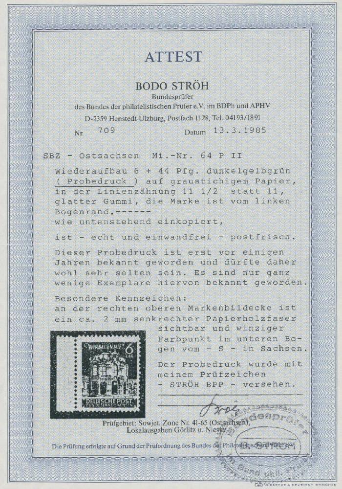 | Zusatzinformationen und Suchstichworte: | Ulrich Felzmann 175. Auktion Auktionstermin: 30. Juni 2022 Los 6099 SBZ Ostsachsen 6 Pfg Dresdner Zwinger schwärzlichgelbgrün, postfrischer Probedruck auf Schreibmaschinenpapier, Fotoattest Ströh und Dr. Jasch BPP "... einwandfrei", € 1.400,- Ausruf 300,00 EUR |