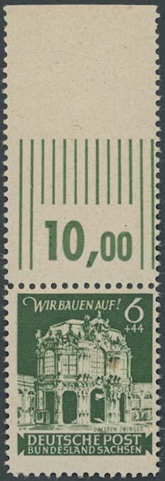 | Zusatzinformationen und Suchstichworte: | Ulrich Felzmann 175. Auktion Auktionstermin: 30. Juni 2022 Los 6100 SBZ Ostsachsen 6 Pfg Wiederaufbau dunkelgraugrün mit Zähnungsvariante 11:11½, postfrisch mit Oberrand, Pracht, Fotoattest Dr. Jasch BPP "... einwandfrei", € 750,- Ausruf 200,00 EUR |