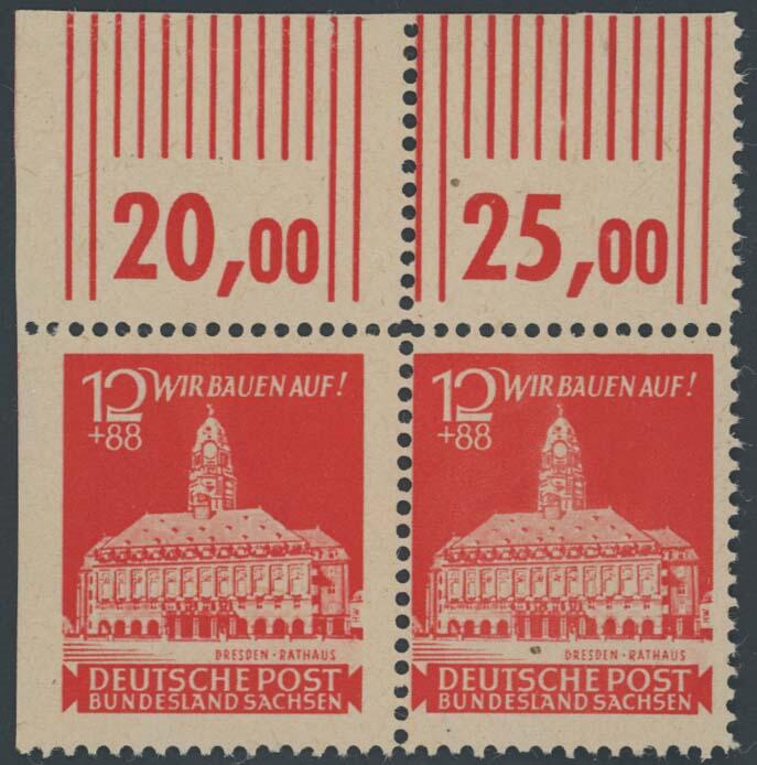 | Zusatzinformationen und Suchstichworte: | Ulrich Felzmann 175. Auktion Auktionstermin: 30. Juni 2022 Los 6102 SBZ Ostsachsen 12 Pfg Wiederaufbau rot, postfrischer Probedruck auf Schreibmaschinenpapier, Oberrandpaar, die linke Marke links ungezähnt, Fotoattest Dr. Jasch BPP "... einwandfrei", € 750,- Ausruf 450,00 EUR |