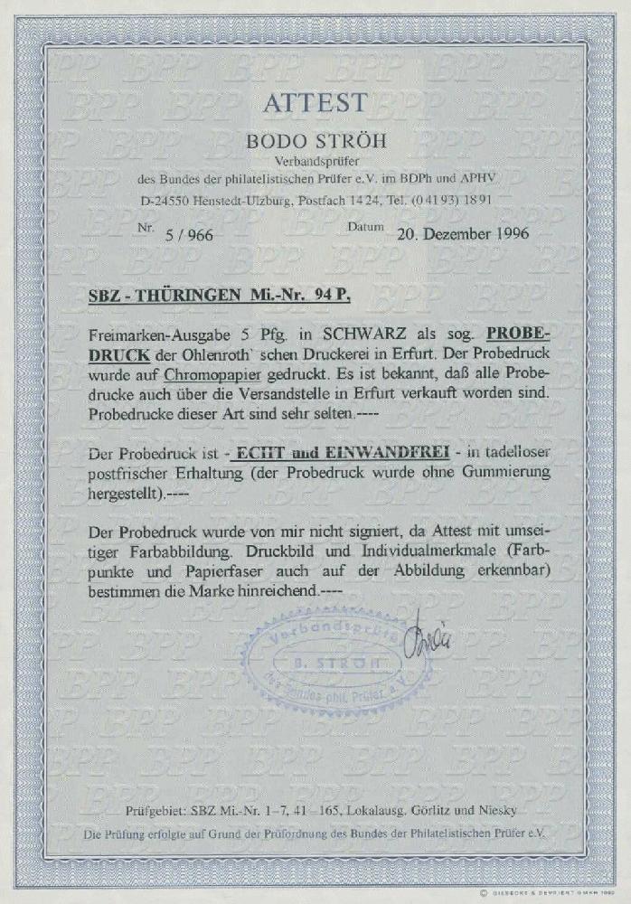 | Zusatzinformationen und Suchstichworte: | Ulrich Felzmann 175. Auktion Auktionstermin: 30. Juni 2022 Los 6105 SBZ Thüringen 5 Pfg schwarz, Probedruck auf ungummiertem Chromopapier, Fotoattest Ströh und Dr. Jasch BPP "... einwandfrei", € 1.000,- Ausruf 200,00 EUR |