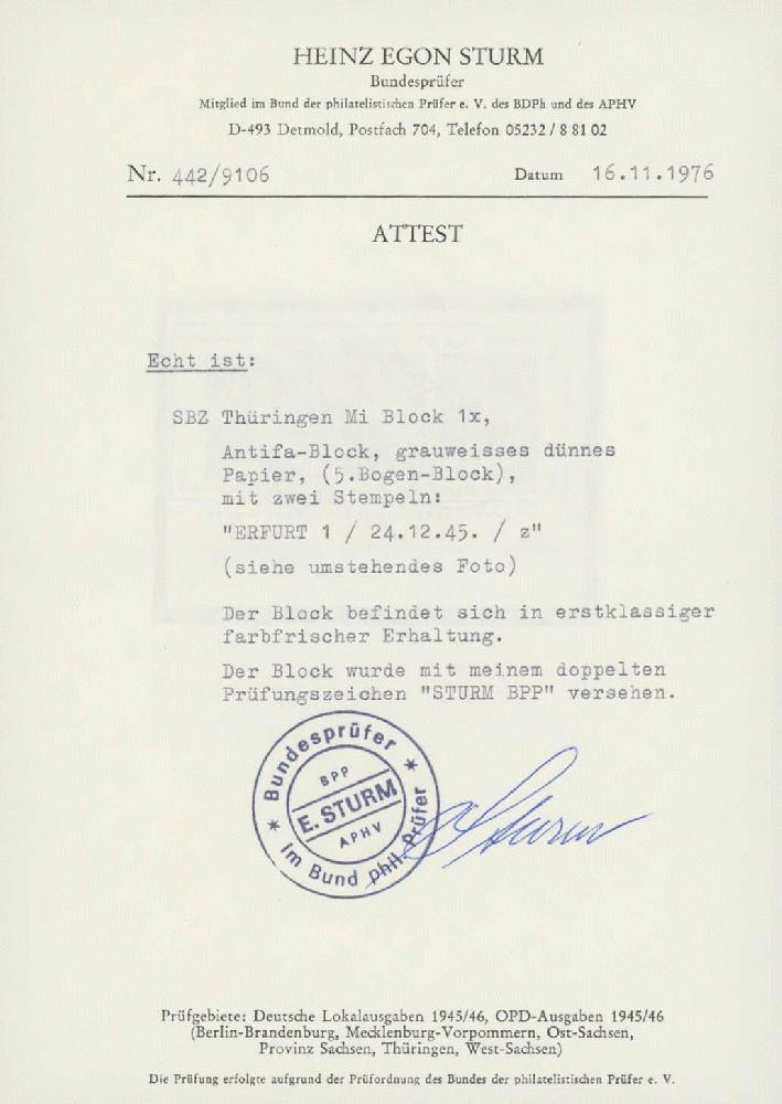 | Zusatzinformationen und Suchstichworte: | Ulrich Felzmann 175. Auktion Auktionstermin: 30. Juni 2022 Los 6111 SBZ Thüringen Antifa-Block auf dünnem Papier, linke untere Bogenecke mit zwei klaren Stempeln ERFURT 24.12.45, doppelt sign., Fotoattest Sturm BPP "... in erstklassiger farbfrischer Erhaltung" Zuschlag 1.050,00 EUR |