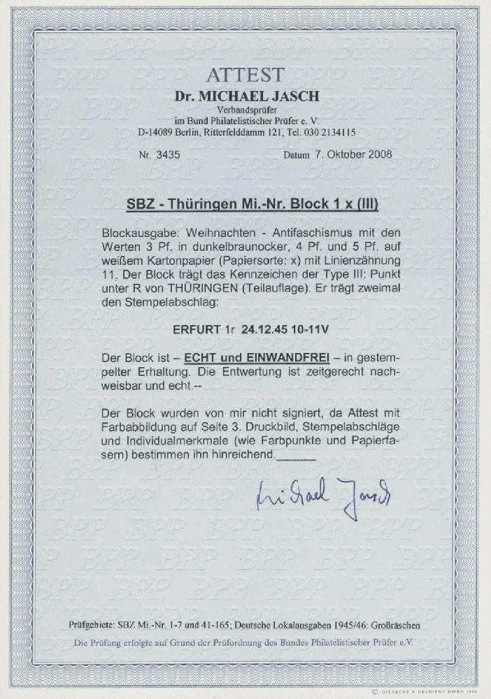 | Zusatzinformationen und Suchstichworte: | Ulrich Felzmann 175. Auktion Auktionstermin: 30. Juni 2022 Los 6112 SBZ Thüringen Weihnachtsblock, dunkelbraunocker auf weißem Kartonpapier, Type III, gestempelt ERFURT 24.12.45, Fotoattest Jasch BPP "... einwandfrei", € 1.100,- Ausruf 300,00 EUR |