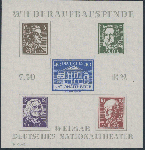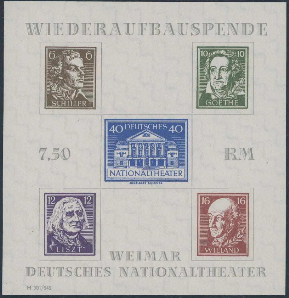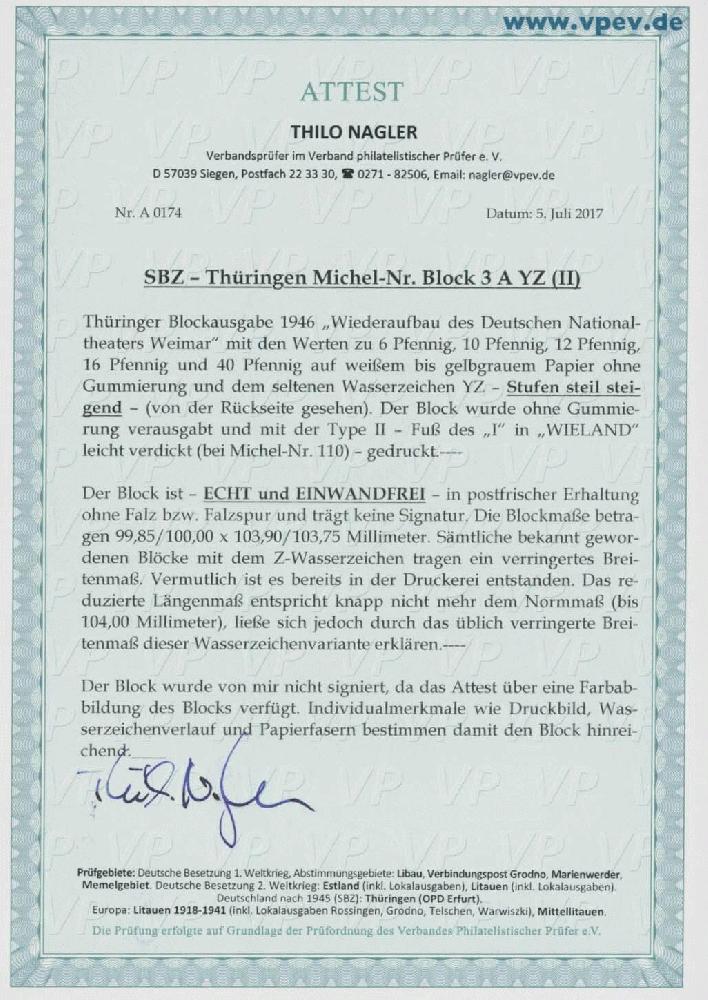 | Zusatzinformationen und Suchstichworte: | Ulrich Felzmann 175. Auktion Auktionstermin: 30. Juni 2022 Los 6116 SBZ Thüringen Ungezähnter Theaterblock der Plattentype II mit der überaus seltenen Wasserzeichenvariante "Stufen steil steigend", ungebraucht auf ungummiertem Papier, tadellos erhalten in der für diese Varianten typischerweise etwas geringeren Normgröße 99,85 x 103,75 mm, Fotoattest Nagler "... einwandfrei" - Diese Variante fehlt oftmals selbst in den größten Sammlungen, € 38.000,- Zuschlag 7.500,00 EUR |