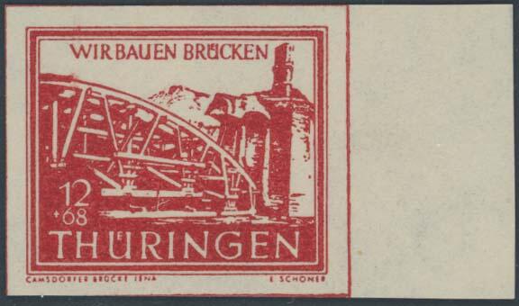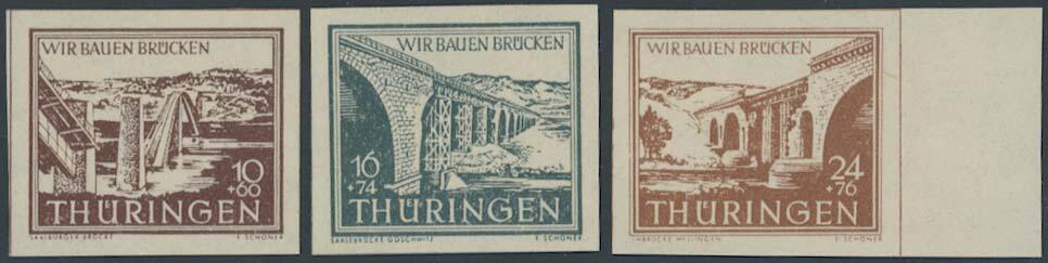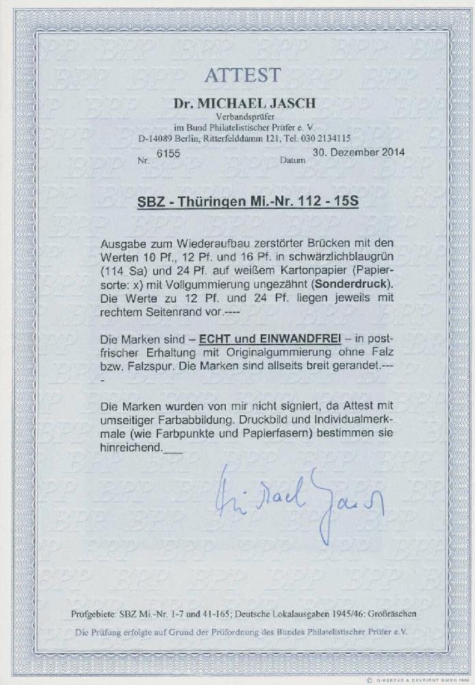 | Zusatzinformationen und Suchstichworte: | Ulrich Felzmann 175. Auktion Auktionstermin: 30. Juni 2022 Los 6118 SBZ Thüringen Brückenbau, kompletter Satz ungezähnter Sonderdrucke auf weißem Kartonpapier mit Vollgummierung, Fotoattest Dr. Jasch BPP "... einwandfrei" Ausruf 150,00 EUR |
