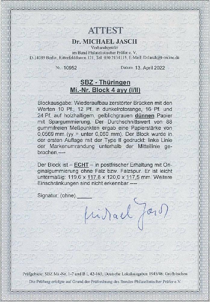 | Zusatzinformationen und Suchstichworte: | Ulrich Felzmann 175. Auktion Auktionstermin: 30. Juni 2022 Los 6122 SBZ Thüringen Brückenbau-Block auf dünnen Papier, Type II in leicht untermaßigem Format 119,6 x 117,8 x 120 x 117,5 mm, darüber hinaus einwandfrei und völlig unsigniert, nur selten anzutreffende Erhaltung ohne jegliche weitere Einschränkung dieses empfindlichen Papiers, Fotoattest Jasch BPP, € 2.600,- Zuschlag 360,00 EUR |