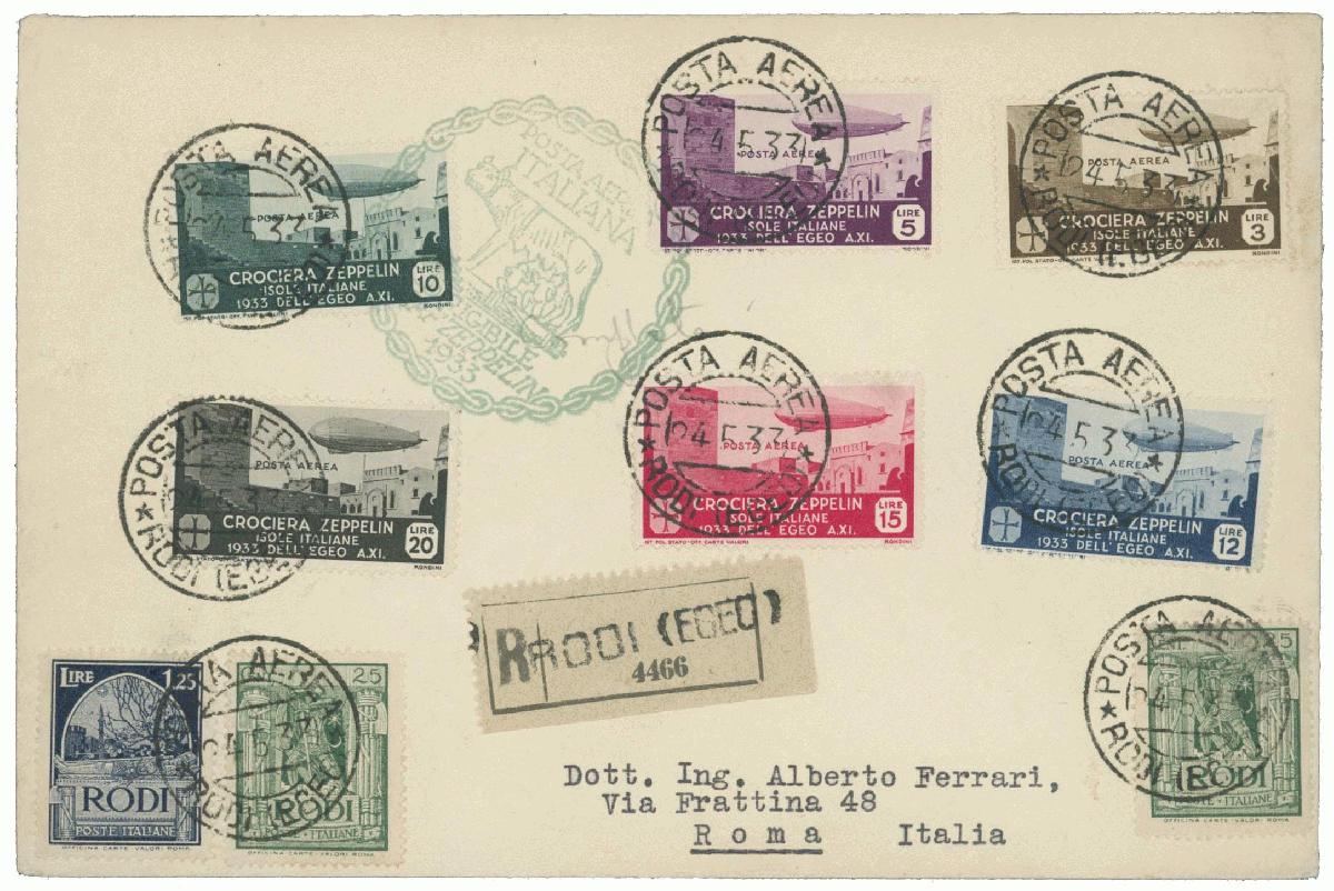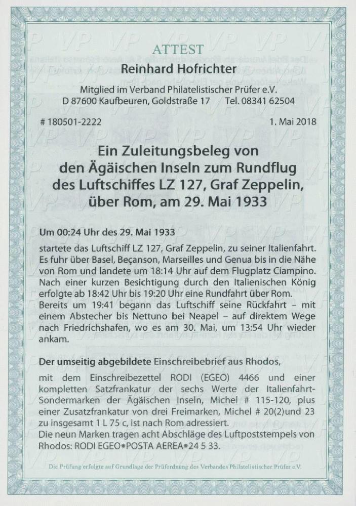 | Zusatzinformationen und Suchstichworte: | Ulrich Felzmann 175. Auktion Auktionstermin: 30. Juni 2022 Los 3087 Ägäische Inseln Italienfahrt 1933, Rundfahrt, Ägäische Inseln Post, R-Brief ab Rhodos 24.5. nach Rom mit sechs Werten Zeppelin komplett, türkisgrüner Flugstempel, Ank.-SST Rom 29.5. sowie vom zuständigen Zustellpostamt Rom 30.5. rs., seltener Satzbrief, Pracht, Fotoattest Hofrichter (Longhi 343 - ca. 8.000 €) Zuschlag 800,00 EUR |