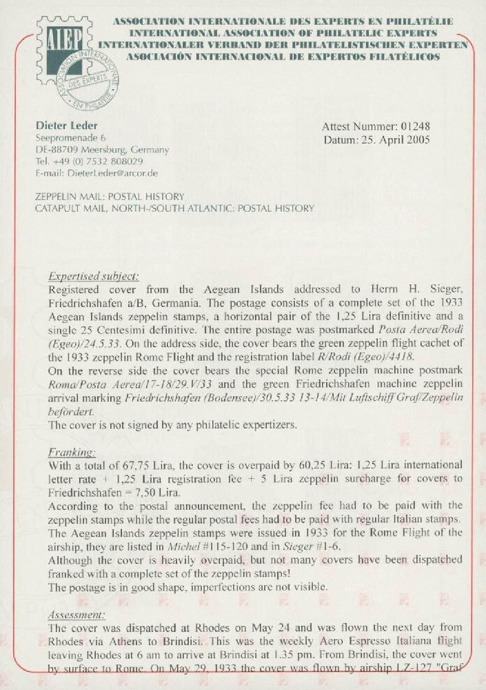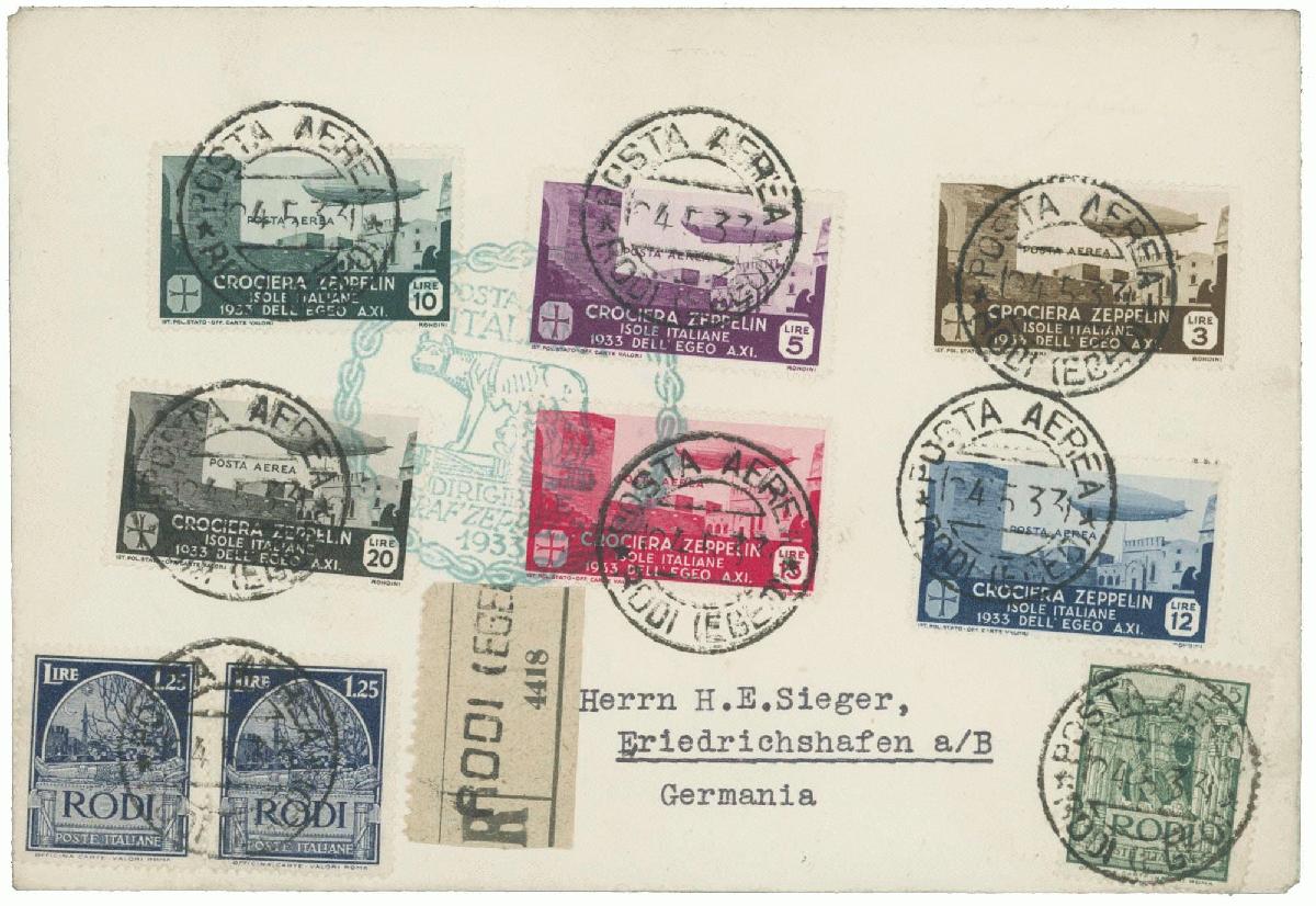 | Zusatzinformationen und Suchstichworte: | Ulrich Felzmann 175. Auktion Auktionstermin: 30. Juni 2022 Los 3088 Ägäische Inseln Italienfahrt 1933, Rückfahrt, Ägäische Inseln Post, R-Brief ab Rhodos 24.5. nach Friedrichshafen mit sechs Werten Zeppelin komplett, türkisblauer Flugstempel, Ank.-SST Rom 29.5. und Ankunft Friedrichshafen 30.5. mit Maschinen-SST rs., seltener Satzbrief, Pracht, Fotoattest Leder AIEP (Longhi 353 - ca. 8.000 €) Zuschlag 800,00 EUR |