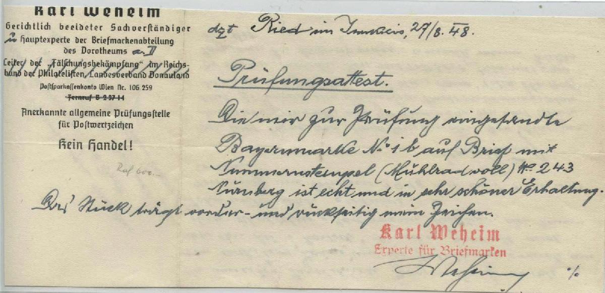| Zusatzinformationen und Suchstichworte: | 8. Tiergarten Briefmarken und Münzen Auktion Auktionstermin: 01. Juli 2022 Los 3 Altdeutschland Bayern 1 Kreuzer schwarz, Platte 2, allseits breitrandig, links und unten mit vollen Zwischenlinien. Frische, tiefe Farbe und in feiner tadelloser Erhaltung mit Mühlradstempel " 243 " und beigesetztem Zier-K2 " Nürnberg 30. DEC. 1850 " auf Drucksache ohne Adressenschleife, innen nach Hersbruck adressiert. Eine besonders schöne Einzelfrankatur des Schwarzen Einsers in exellenter Qualität! Geprüft Pfenninger und Fotoattest Brettl BPP. Ausruf 2.800,00 EUR |