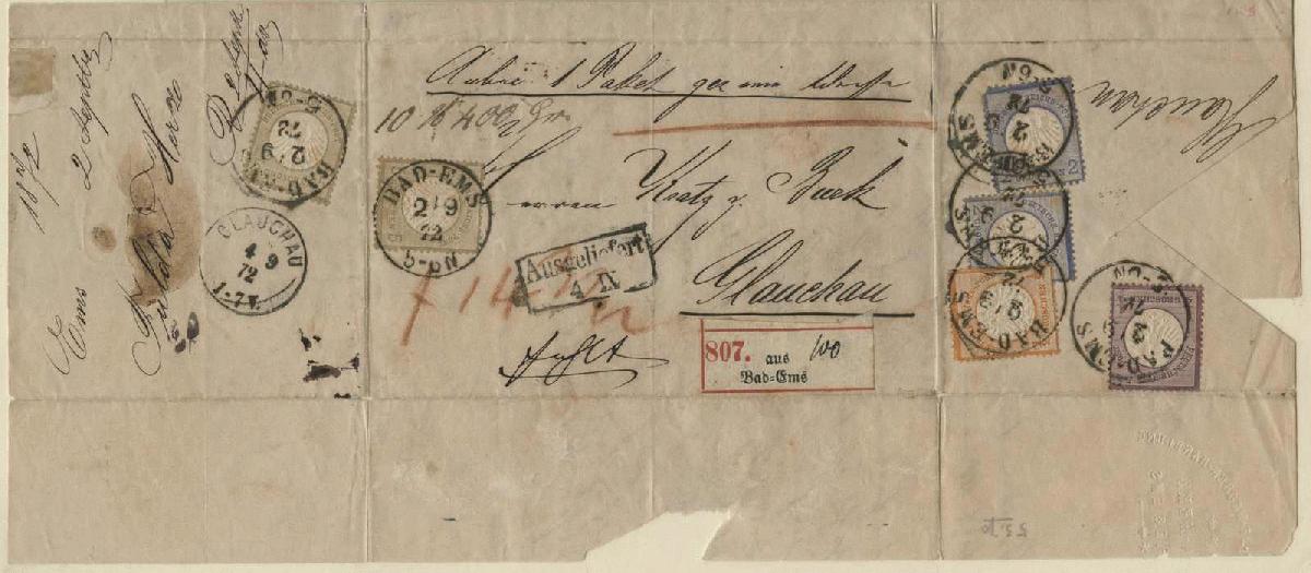 | Zusatzinformationen und Suchstichworte: | 8. Tiergarten Briefmarken und Münzen Auktion Auktionstermin: 01. Juli 2022 Los 130 Deutsches Reich, 1872 Kleiner Brustschild 1/4 Groschen violett, 2 Groschen blau (2), 5 Groschen ockerbraun (2) je Kleiner Adler in Mischfrankatur mit 1/2 Groschen orange Großer Adler auf portogerechtem Paketbegleitbrief von Bad-Ems nach Glauchau. Die vorder-und rückseitig verklebten Werte sind farbfrisch und sehr gut geprägt, teils fehlerhaft, etwas Patina. Nicht häufige Vierfarbenfrankatur. Fotobefund Brugger BPP Ausruf 900,00 EUR |