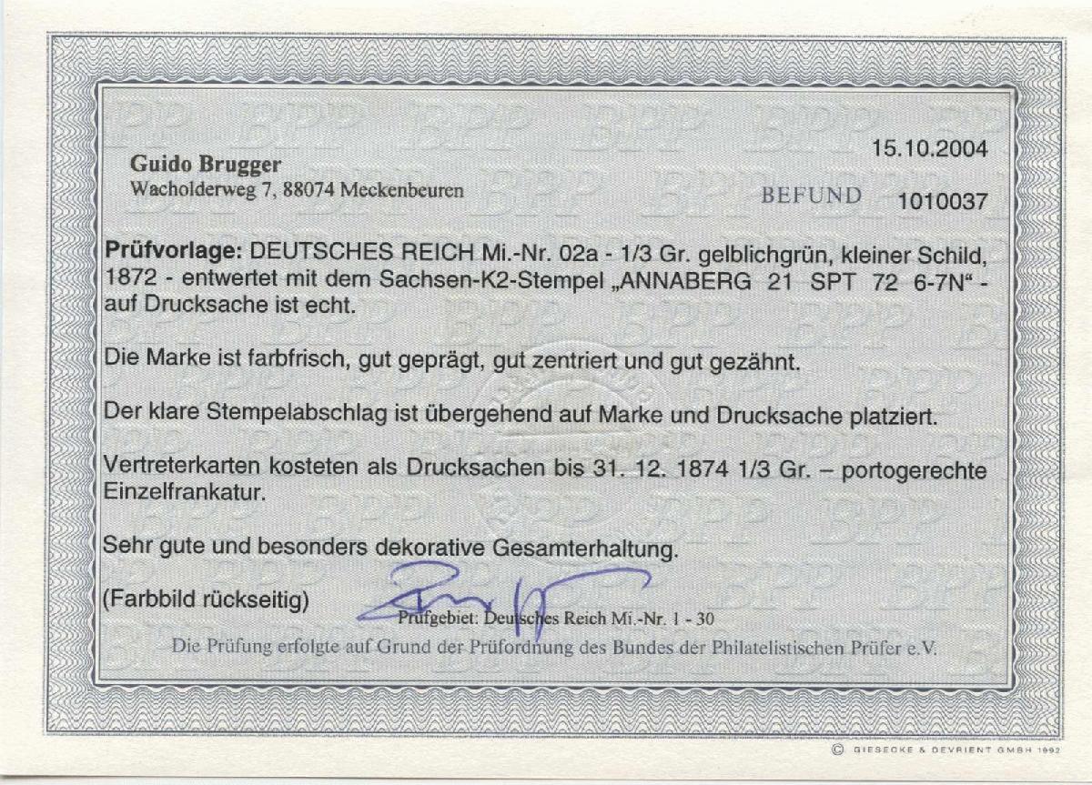 | Zusatzinformationen und Suchstichworte: | 8. Tiergarten Briefmarken und Münzen Auktion Auktionstermin: 01. Juli 2022 Los 139 Deutsches Reich, 1872 Kleiner Brustschild 1872, 1/3 Gr. gelblichgrün mit Sachsen-Stempel "Annaberg", Kabinettstück auf Vertreterkarte, portpgerecht, Fotobefund Brugger BPP Ausruf 70,00 EUR |