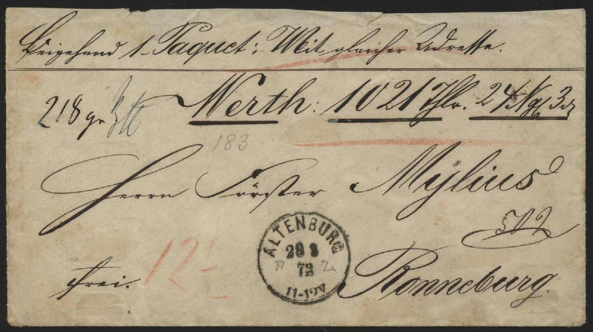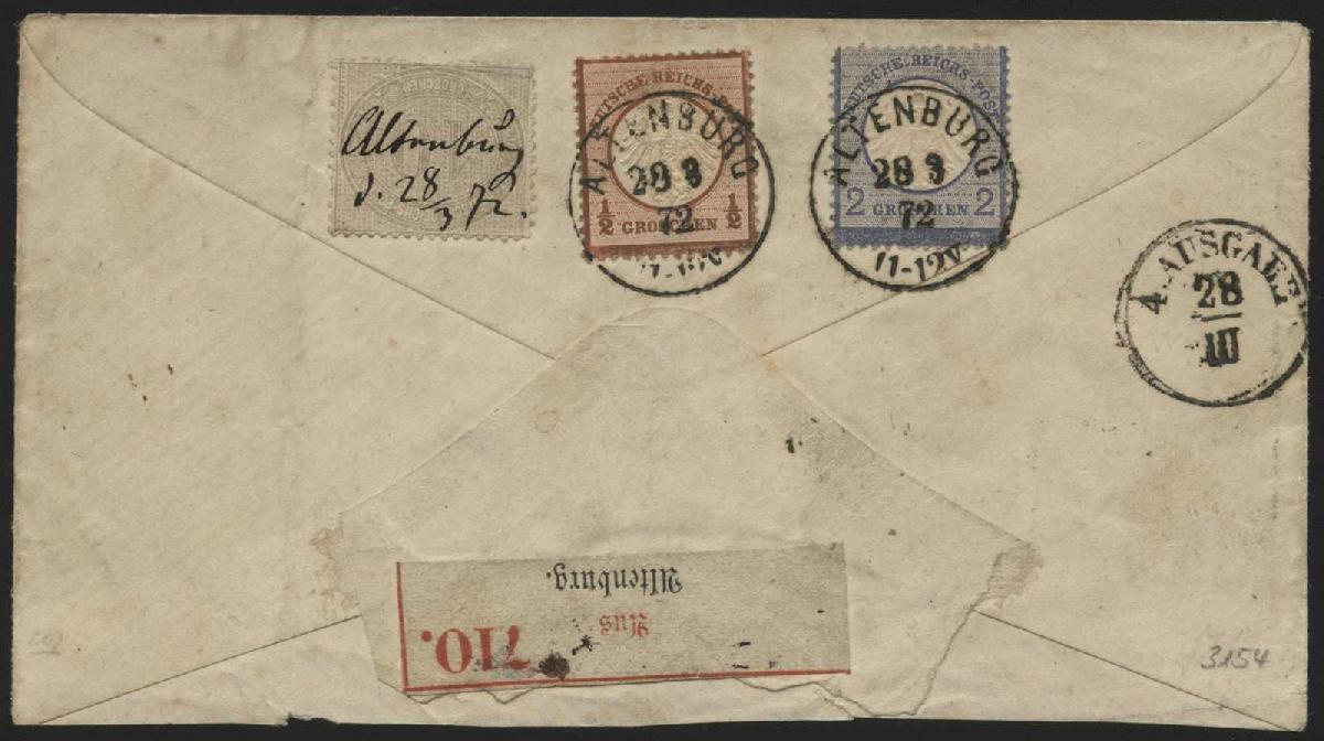 | Zusatzinformationen und Suchstichworte: | 8. Tiergarten Briefmarken und Münzen Auktion Auktionstermin: 01. Juli 2022 Los 144 Deutsches Reich, 1872 Kleiner Brustschild 1/2 Groschen ziegelrot (oxidiert) zusammen mit 2 Groschen blau und 10 Groschen Ziffer (Knitter) als Dreifarbenfrankatur auf Paketbegleitbrief aus Altenburg nach Ronneburg, Fotobefund Sommer BPP Ausruf 350,00 EUR |