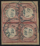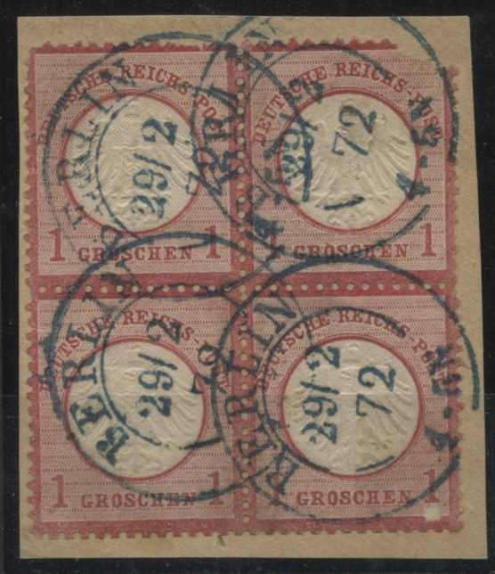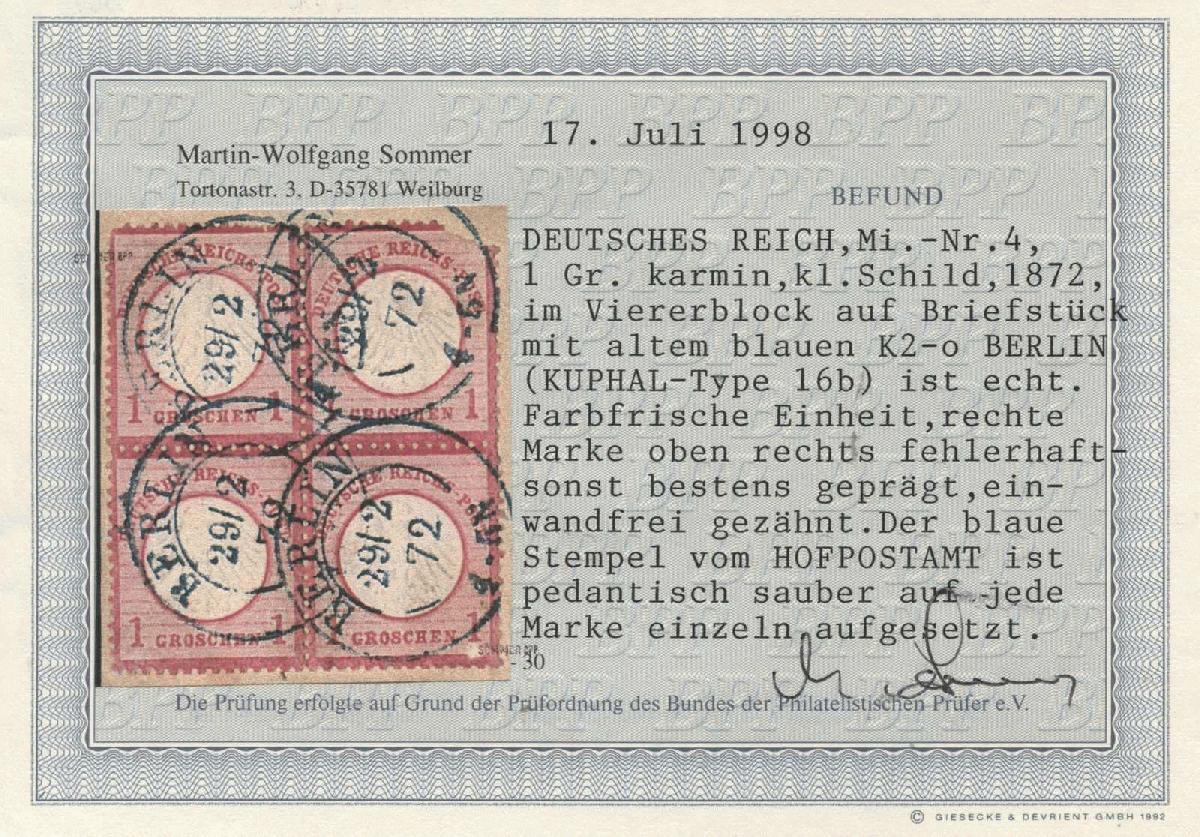 | Zusatzinformationen und Suchstichworte: | 8. Tiergarten Briefmarken und Münzen Auktion Auktionstermin: 01. Juli 2022 Los 149 Deutsches Reich, 1872 Kleiner Brustschild 1 Groschen karmin, Viererblock mit altem blauen K2 von Berlin ( Kuphal - Type 16b ), obere und untere rechte Marken fehlerhaft. Der blaue Stempel vom Hofpostamt ist pedantisch sauber auf jede Marke einzeln aufgesetzt. Fotobefund Sommer BPP Ausruf 150,00 EUR |